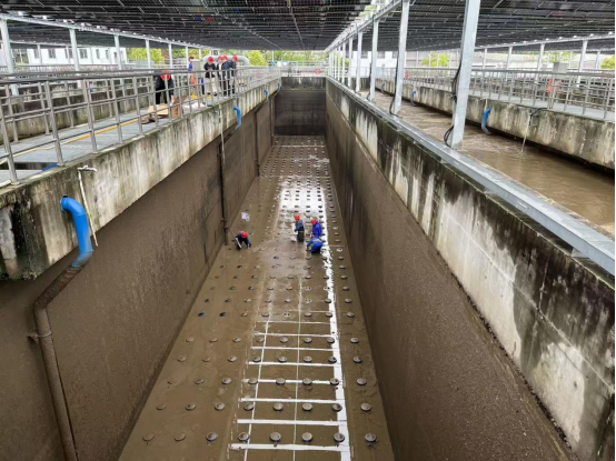 作业过程中,严格落实安全生产管控要求,严守作业安全规范,对可复用曝气盘完成深度清垢,彻底恢复设备曝气性能;对老化破损、充氧效率不达标的曝气盘,全部更换为高效节能型微孔曝气盘,从严把控各环节作业标准,推动本次作业保质保量落实到位。